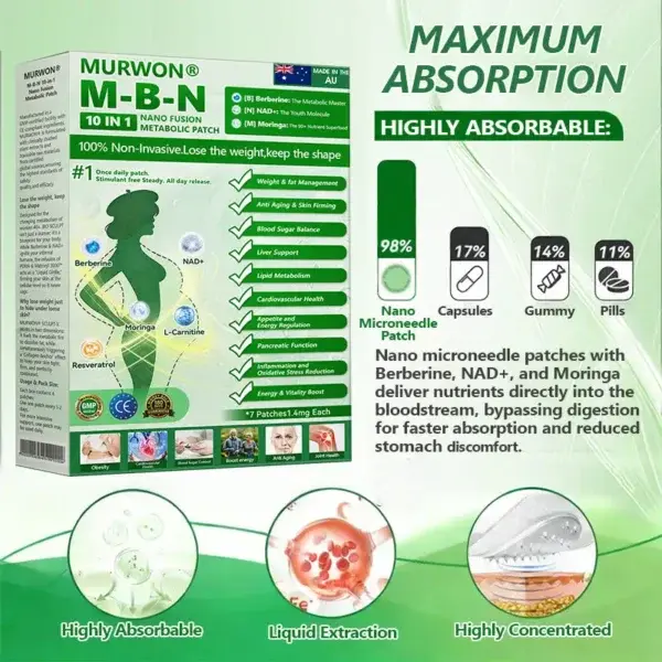 We then moved to large-scale clinical studies with over 5,000 participants, validating the performance of the MURWONยฎ ๐ญ๐-in-1 Nano-Microneedle Berberine Patch. These benefits are particularly powerful for adults over 40. Backed by contemporary medical research, our product has undergone rigorous review under CE regulatory standards, confirming its safety and efficacy. This formulation represents a major scientific breakthrough, offering a natural, sustainable option for long-term weight management.โ